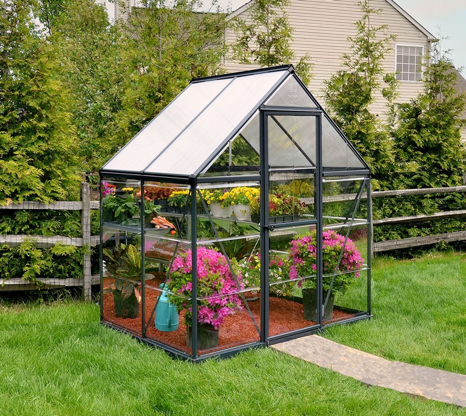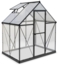 Das Palram - Canopia Aluminium Gewächshaus Hybrid 64 in Anthrazit misst 126 x 185 x 208 cm und besticht durch eine robuste Aluminium-Konstruktion, verzinkten Stahlsockel und hochwertige Kunststoff-Paneelen. Mit 100 % UV-beständigen Polycarbonat-Doppelstegplatten auf dem Dach und kristallklaren Polycarbonat-Paneelen an den Seiten bietet es optimale Lichtdurchlässigkeit. Das Gewächshaus verfügt über ein belüftbares Fenster, eine bequeme Traufhöhe und ein einfaches Schiebepaneel-Montagesystem.
