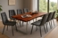 Der Esstisch Quinn aus massiver Akazie in Nussbaumfarben mit Baumkante und silbernem U-förmigem Metallgestell ist ein einzigartiges Möbelstück für Ihren Essbereich. Mit einer großzügigen Tischplatte von 280 x 100 cm bietet er Platz für 8-12 Personen. Jedes Exemplar ist ein Unikat, das durch natürliche Astlöcher und Spalten besticht und somit einen individuellen Charakter erhält.