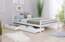 Zeitloses Design. Das elegante Doppelbett „Nadine“ in den Maßen 140 x 200 cm überzeugt mit seinem zeitlosen Design. Das stilvolle Kopf- und Fußteil fügt sich dank seiner geradlinigen Optik perfekt in jeden Raum ein. Das Bett ist sowohl für Jugendliche als auch Erwachsene gedacht, die einen komfortablen Schlafplatz in einem schlichten Look bevorzugen. „Nadine“ ist in zwei Farbausführungen erhältlich: Weiß und Natur. Natürlich umweltfreundlich. Unsere Ti CAA Betten werden ausschließlich mit umweltfreundlichen und geruchsarmen Lacken auf Wasserbasis behandelt. Das weiße Doppelbett „Nadine“ wurde mit einem matten Wasserlack verarbeitet, der noch eine natürliche Holzmaserung erkennen lässt. Das Bett in der Farbe Natur ist dagegen unbehandelt geblieben und trägt deshalb zu einem gesunden Raumklima bei, da es Schadstoffe und Feuchtigkeit aus der Umgebung absorbiert. Langlebiges Material. „Nadine“ besteht aus massivem und nachhaltigem Kiefernholz mit einer Holzstärke von 20 mm. Für besondere Stabilität sorgt der Mittelbalken, der unter der Liegefläche des Bettgestells verbaut ist. Das Doppelbett verspricht, dank der hochwertigen Materialien, die darin verarbeitet wurden, eine lange Lebenserwartung. Durch die Verwendung von robustem Kiefernholz wird nicht nur eine beeindruckende Langlebigkeit gewährleistet, sondern auch eine natürliche Schönheit, die im Laufe der Zeit Bestand hat. Optional erweiterbar. „Nadine“ ist kein gewöhnliches Doppelbett, du kannst es ganz nach deinem Geschmack in ein praktisches Funktionsbett verwandeln. Der Platz unter der Liegefläche lässt sich nach Belieben mit zwei Optionen ausstatten. Um mehr Stauraum zu schaffen, steht unser Schubkasten-Set zur Verfügung, das sich mühelos unter das Bett rollen lässt. Den Platz unter der Liegefläche kannst du maximal nutzen, wenn das Bett von beiden Seiten zugänglich ist – dann lässt sich „Nadine“ sogar um vier Schubkästen erweitern. Besonderheiten. aus massiver und nachhaltiger Kiefer. hochwertige Verarbeitung. zeitloses Design. stabile Pfosten (Holzstärke 20 mm). FSC®-zertifiziert. optionales Zubehör. Liegefläche. 140 x 200 cm,. Abmessungen*. Tiefe: 206 cm. Breite: 146 cm. Höhe: 50 cm (Kopfteil 60 cm). Einlasstiefe: 6,5 cm. Max. Matratzenhöhe: 16-18 cm. Material. Kiefer-Massivholz. Lieferumfang. Doppelbett(Gestell). Ohne Dekoration. Rollrost, Matratze und Schubkasten-Set separat erhältlich. *Alle Angaben sind Circa-Werte