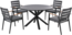 Gartenmöbel Set 4-Sitzer MALETTO TAVIANO in Schwarz bietet Ihnen einen stilvollen und komfortablen Platz im Freien. Der runde Tisch aus robustem Aluminium und Keramikglas ist witterungsbeständig und langlebig. Die vier Stühle mit Armlehnen in heller Holzoptik sind platzsparend stapelbar und verfügen über abnehmbare, pflegeleichte Kissenbezüge aus strapazierfähigem Polyester.