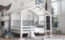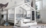 Kinderbett im Haus-Design aus Kiefer-Massivholz mit einer Liegefläche von 90x200 cm. Die markante Dachform und die große Vordertafel (84x39 cm) fördern kreatives Spielen und Malen. Mit zwei praktischen Schubladen bietet das Bett zusätzlichen Stauraum. Die weiße, pflegeleichte Oberfläche und die stabile Konstruktion sorgen für Sicherheit und Langlebigkeit im Kinderzimmer.