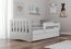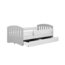 Das Bjird Kinderbett Classic ist in den Größen 80x140 cm, 80x160 cm und 80x180 cm erhältlich und bietet mit einem verstellbaren Rausfallschutz (100 cm) sowie einer praktischen Schublade zusätzlichen Komfort. Die stabile Konstruktion aus hochwertiger laminierter Möbelplatte ist bis zu 100 kg belastbar und sorgt für Sicherheit dank abgerundeter Ränder. Die Frontseiten bestehen aus MDF-Platte, die mit Ökofarben behandelt wurde.