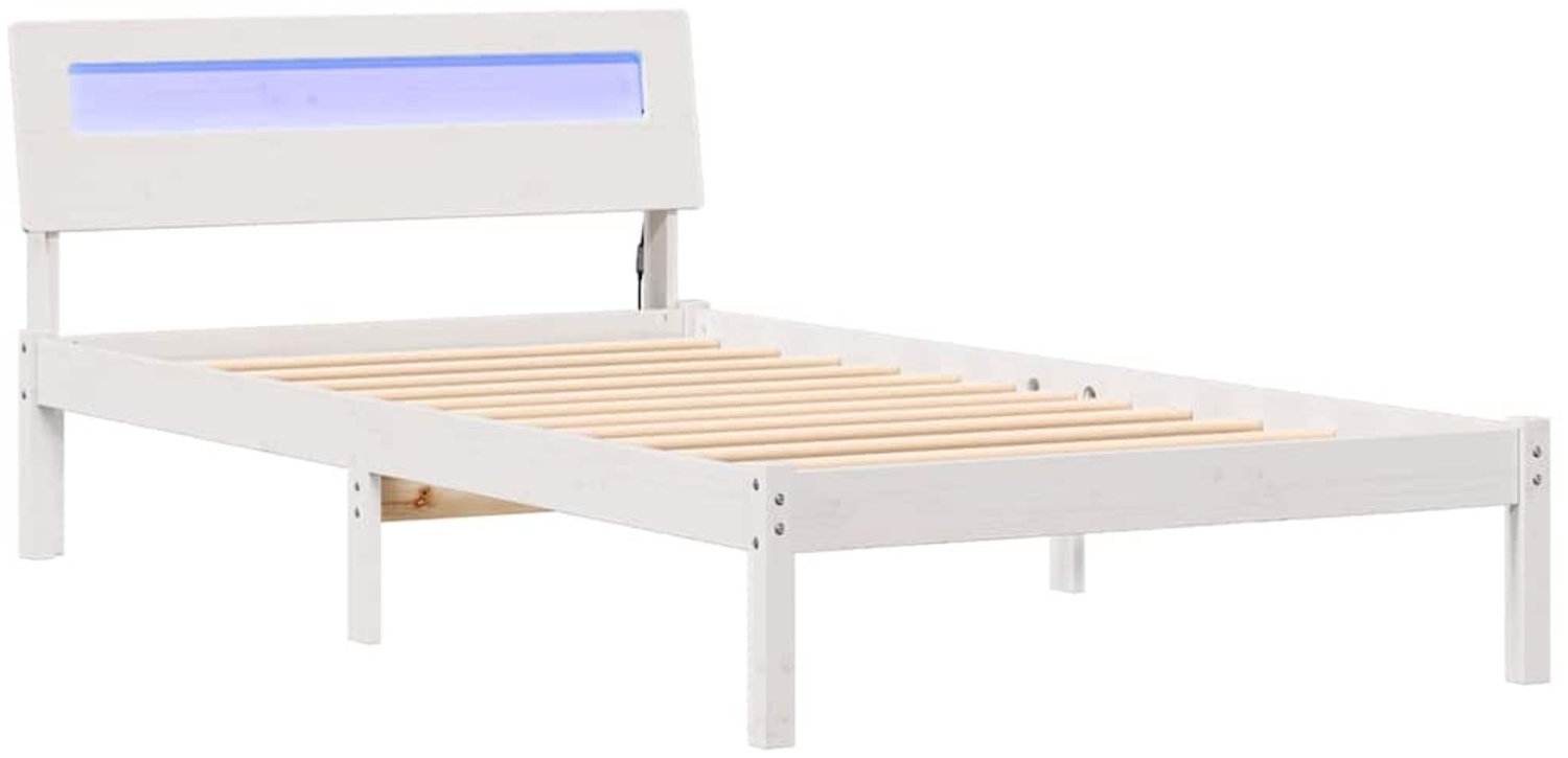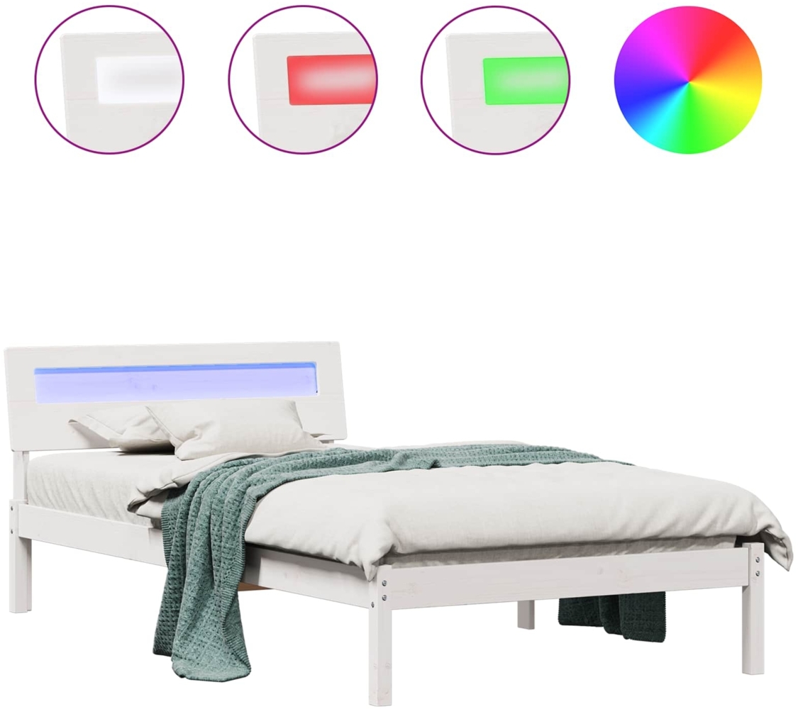 vidaXL Bettgestell mit Kopfteil in Weiß, gefertigt aus massivem Kiefernholz, bietet eine stabile Unterstützung und einen modernen Look. Mit den Abmessungen 202 x 80,5 x 73 cm (L x B x H) und einer maximalen Belastbarkeit von 110 kg ist es ideal für zwei Personen. Die integrierten LED-Streifen schaffen eine stimmungsvolle Atmosphäre, während das Design ohne Boxspring eine einfache Montage ermöglicht. Pflegeleicht und langlebig, ist dieses Bettgestell die perfekte Wahl für Ihr Schlafzimmer.