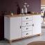 Die IDIMEX Apothekerkommode Anrichte Colmar ist eine elegante Lösung für Ihren Flur, Esszimmer oder Wohnzimmer. Mit den Abmessungen von 133 x 80 x 39 cm (B x H x T) bietet sie großzügigen Stauraum hinter 2 Türen und in 4 geräumigen Schubladen. Gefertigt aus massiver Kiefer und lackiert, bleibt die natürliche Holzmaserung sichtbar. Edle Muschelgriffe aus Metall und Kugelfüße aus Massivholz verleihen der Kommode ihren charmanten Landhausstil.