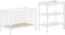 Das Babymöbel-Set >Dino< in Buche Weiß vereint Funktionalität und ansprechendes Design. Es besteht aus einem Gitter-Babybett und einem Wickelregal, gefertigt aus massivem, weiß lackiertem Buchenholz. Das Babybett hat eine Liegefläche von 60x120 cm und einen 3-fach höhenverstellbaren Lattenrost. Das Wickelregal bietet drei Ablage-Ebenen und eine praktische Umrandung für die Wickelauflage.
