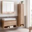 Das Fackelmann NATURA Badmöbelset ist ein modernes, 4-teiliges Set, das Ihrem Badezimmer einen natürlichen und stilvollen Look verleiht. Die Möbel in hellbrauner Ast-Eiche-Optik sind grifflos gestaltet und bieten mit einer Großraumschublade sowie einem offenen Ablagefach ausreichend Stauraum. Das hochwertige, 61 cm breite Aufsatzwaschbecken aus Keramik und der große LED-Spiegelschrank mit technischen Raffinessen runden das Set ab. Der Hochschrank mit Ablagefach sorgt für Ordnung.