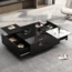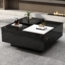 Der quadratische Couchtisch mit den Maßen 75 x 75 x 33,5 cm besticht durch sein modernes Hochglanz-Design in Schwarz mit weißen Kontrastelementen. Die dezente Holzmaserung verleiht ihm einen rustikalen Touch. Mit vier versteckten Schubladen bietet er großzügigen Stauraum für Alltagsgegenstände. Die robuste Konstruktion aus Spanplatten sorgt für Stabilität und eine Tragkraft von bis zu 30 kg. Dank der 9 cm Bodenfreiheit ist der Tisch ideal für Reinigungsroboter geeignet.