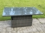 - Materialien: Polyrattan, Stoff, verzinkter Stahl, Schaum, Glas
