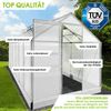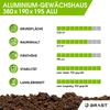 Das BRAST Gewächshaus aus rostfreiem Aluminium mit TÜV-geprüften 6mm Platten und Fundament bietet eine Grundfläche von 7,03m². Mit Maßen von 380 x 190 x 195 cm (Höhe inkl. Fundamentrahmen 208cm) und einem Rauminhalt von 11,7m³ ist es geräumig. Die Seitenhöhe beträgt 125cm, die Firsthöhe 195cm. Das Gewächshaus besteht aus Aluminiumprofilen und Polykarbonat Hohlkammerstegplatten. Mit einem Gewicht von ca. 53kg wird es zerlegt in 2 Paketen geliefert. TÜV-geprüft und zertifiziert auf Gebrauchstauglichkeit, Lebensdauer, Korrosionsbeständigkeit, Stabilität und Sicherheit gegen Lasten. Die Durchgangshöhe von 195cm (mit Fundament 208cm) ermöglicht bequeme Bewegung im Gewächshaus. Verstärkungsstreben-System und 6mm Hohlkammerstegplatten sorgen für Stabilität und Schutz. Das Stahl-Fundamentrahmen mit Anti-Rost-Verzinkung gewährleistet Standfestigkeit. Die Ausstattung umfasst eine leichtgängige Schiebetür, höhenverstellbare Fenster, Regenwasser-Fallrohre, Haken für flexible Nutzung und eine deutsche Aufbauanleitung.