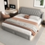 Dieses Leinen-Polsterbett 180x200 cm vereint zeitloses Design mit hoher Funktionalität. Es bietet ein gepolstertes Kopfteil, stabile Holzlatten und zwei praktische Stauraumschubladen. Die integrierte LED-Beleuchtung sorgt für stimmungsvolles Licht, während das weiche Leinenmaterial für ein angenehmes Hautgefühl sorgt. Mit einer maximalen Belastbarkeit von 300 kg ist es ideal für moderne und klassische Wohnräume.