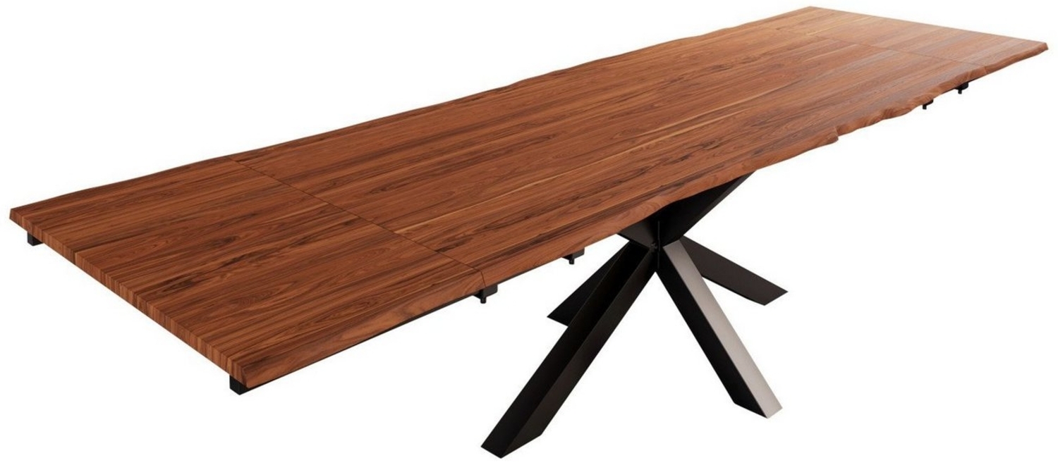 Edler Esszimmertisch Soroa aus massivem Akazienholz mit echter Baumkante und einem stabilen Spider-Gestell aus schwarzem Metall. Mit einer Gesamtlänge von 220 cm (erweiterbar auf 320 cm) und einer Breite von 100 cm bietet dieser Tisch ausreichend Platz für gesellige Runden. Die ausgeprägte Maserung und die naturbelassenen Tischkanten machen jedes Stück zu einem einzigartigen Unikat. Pflegeleicht und zeitlos im Design, fügt sich der Tisch harmonisch in verschiedene Einrichtungsstile ein.