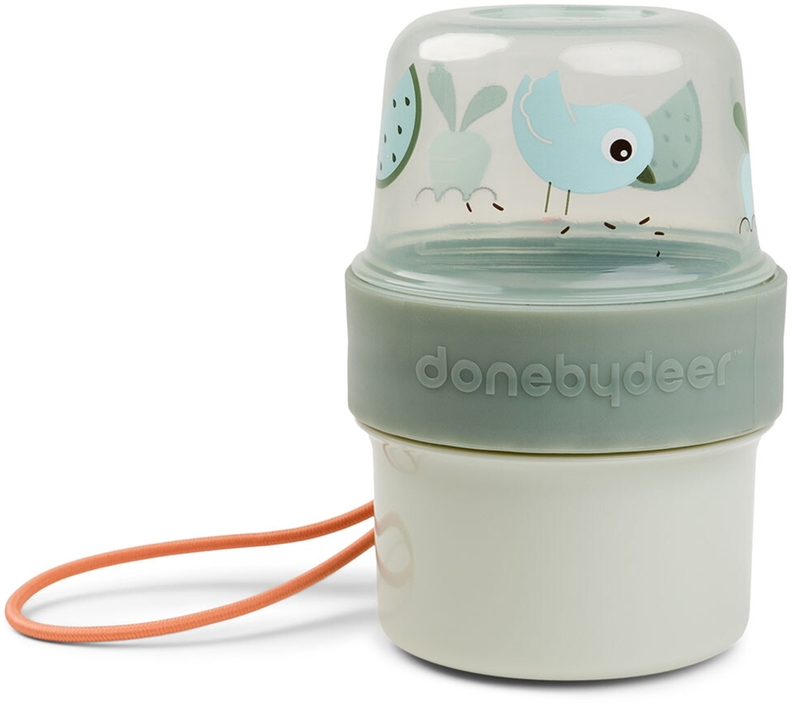 Die Done By Deer To go 2-way Snack-Behälter S Birdee in Grün ist der perfekte Begleiter für kleine Snack-Liebhaber. Mit einem Durchmesser von 8 cm und einer Höhe von 11,5 cm bietet der zweiteilige Behälter zwei luftdicht verschließbare Kammern mit jeweils 150 ml Volumen. Hergestellt aus 100% lebensmittelechtem PP und einem Dichtungsring aus 100% Silikon, ist er ideal für Joghurt, Obst, Cracker oder Nüsse. Spülmaschinenfest und mikrowellengeeignet ohne Deckel, unterstützt er selbstständiges Snacken.