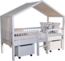 FORREST Buche - halbhohes Hausbett inkl. Dachaufbau mit Textilhimmel und 2 Rollboxen, mit einer Liegefläche von 90 x 200 cm und gerader Leiter in der Mitte, ideal zum Spielen und Schlafen. Ein massiver Rolllattenrost mit 15 Leisten ist bereits im Lieferumfang enthalten. Ein Abenteuerspielplatz im Kinderzimmer. Der Artikel ist aus massiver europäischer Buche, die Oberfläche ist weiß lackiert und erfüllt die Anforderungen nach EN71-3. Die schwarzen Schrauben sind sichtbar und setzen einen optischen Akzent. Der Absturzschutz gibt zusätzlich Sicherheit und hat eine fein gearbeitete Sprossen-Optik. Die runden Sprossen haben eine Stärke von ca. 16 mm. Der Abstand vom Boden bis Oberkante Absturzschutz sind ca. 82,5 cm, die Einstiegshöhe bis Oberkante Bettseite ist ca. 50,5 cm und die Höhe von der Oberkante der Bettseite bis Oberkante Absturzschutz ca. 32 cm. Die Leiter mit 1 Trittstufe (Abstand vom Boden ca. 30 cm), hat eine Trittbreite von ca. 35 cm die sicheres Hinauf- und Hinabsteigen ermöglicht. Zusätzlich hat sie seitlich Haltegriffe. Die starken Vierkantstäbe des Bettes und des Dachaufbaus haben ein Maß von ca.: B: 5,5 x T: 5,5 cm. Vorne hat die Dachkante eine Höhe von 135 cm und steigt bis zur Gesamthöhe von 185 cm an. Es darf sich nicht am Dachaufbau hochgezogen werden, oder geschaukelt werden. Der Raum unter der Liegefläche, ist vom Boden bis Unterkante Bettseite ist ca. 41,5 cm hoch und kann noch gut als Stauraum genutzt werden. Das Schubladen-Set gehört zum Lieferumfang. Es besteht aus 2 großen Roll-Containern und schafft Ordnung im Kinderzimmer. Hier findet alles seinen richtigen Platz und es sieht im Nu aufgeräumt aus. Sie laufen auf Rollen und haben Griffaussparungen, wodurch sie einfach zu bewegen sind. Das Innenmaß der Boxen ist ca.: B: 52 x H: 30,5 x T: 36 cm. Die Bodenfreiheit ist ca. 5,5 cm. Stellfläche pro Schublade ca.: B: 57 x H: 32,5 x T: 40 cm. Der Textilhimmel in hellrosa ist zum dekorieren des Dachaufbaus gehört auch zum Lieferumfang. Dadurch bringt er eine besondere Atmosphäre im Bett und dämpft gleichfalls den Lichteinfall. Er wird einfach über das Dachgestänge gelegt und mit dem Band befestigt. Das Material ist aus 100% Baumwolle und nur in professioneller Textilreinigung zu reinigen. Maße Textilhimmel: B: 323,6 x T: 86 cm. Die hochwertige Verarbeitung und sehr gute Stabilität zeichnen dieses Bett aus. Die Pfostenstärke ist ca. 55 x 55 mm. Max. Matratzenhöhe ca. 20 cm. Für Kinder unter 4 Jahren nicht geeignet. Die Ware ist zerlegt, zur einfachen Selbstmontage. Die Matratze, Kissen und Dekoration gehören nicht zum Lieferumfang. FSC®-zertifiziert. Das Bett an sich ist ca. B: 207,5 x T: 97,5 cm. Benötigte Stellfläche halbh. Bett mit Dachaufbau ca. B: 207,5 x H: 185 x T: 107 cm.
