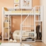 Dieses Hochbett mit einer Liegefläche von 90x200 cm vereint modernes Design mit praktischer Raumökonomie. Der stabile Metallrahmen und die Holzplatten in Weiß schaffen eine luftige Atmosphäre und fügen sich harmonisch in verschiedene Einrichtungsstile ein. Die integrierte Stauraumtreppe bietet Platz für Schuhe und Bücher, während der große, offene Bereich darunter vielseitig genutzt werden kann.