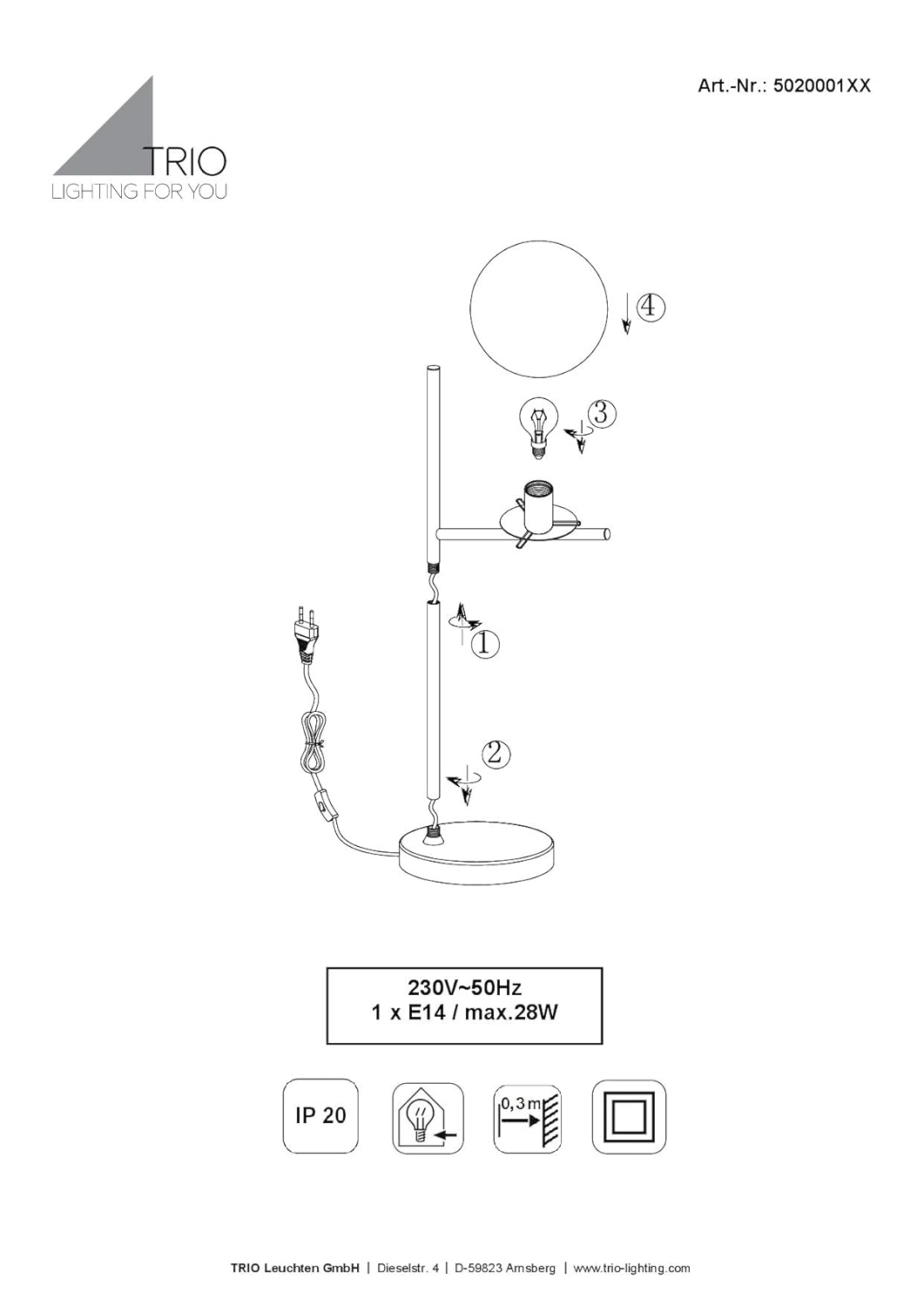 Simpel und absolut stylish!Ob schlichter, gradliniger Einrichtungsstil oder doch etwas verspielter - die Tischleuchte PURE aus dem Hause Trio Leuchten liefert schlichte Deko-Akzente, um jedem Look einen Hauch von Eleganz zu verpassen. Mit ihrem angesagten Retro Design setzt die Kugellampe Kommoden, Nachttische und Sideboards perfekt in Szene und wird schnell zum neuen Blickfang in Ihrem Wohnraum. Das puristisch-minimalistische Design der PURE ist ein Mix aus edler Metall-Optik in Anthrazit Grau und einem rauchfarbigen Glas. Die Tischlampe mit einer Höhe von 52cm und einer Ausladung von 24,2cm überzeugt mit klarem Design. Der Korpus bietet dem Lampenschirm aus Glas eine dezente Basis ohne viel Schnickschnack und die farblich harmonisch aufeinander abgestimmten Oberflächen machen die Leuchte zum Blickfang in jedem Raum. So einzigartig wie das Licht dieser Design Tischlampe, so vielfältig sind auch ihre Einsatzmöglichkeiten: Ob als dekorative Wohnzimmerlampe, die in Form einer auffälligen Leuchte für zusätzliches Licht und moderne Wohnlichkeit sorgt, als zeitgemäße Flurlampe zur Beleuchtung von Fluren und Dielen oder als exklusive Nachttischleuchte in Ihrem Schlafzimmer. Ganz gleich welche Art von Tischlampen Sie benötigen, ob Sie auf der Suche nach zeitgemäßen Wohnzimmerlampen, nach modernen Flurlampen oder besonderen Wohnraumleuchten im Retro Stil sind, all diesen Ansprüchen wird die Trio Tischleuchte in jeder Hinsicht gerecht. Die E14-Fassung kann mit einem Leuchtmittel bestückt werden, das eine Leistung von 28W nicht überschreitet. Da man einen direkten Einblick auf das Leuchtmittel hat und dieses nicht von einem Leuchtenschirm verdeckt wird, empfehlen wir ein Filament Leuchtmittel zu verwenden. Dies lässt es harmonisch erscheinen und vervollständigt das Gesamtbild der schicken Leuchte Über einen Schnurschalter für Ein/Aus lässt sie sich zudem bequem bedienen.