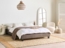 Schlichtes Bettgestell ohne Kopfteil in taupefarbenem Bouclé-Stoffbezug. Das minimalistische Design vereint hohe Qualität und Stabilität, ideal für alle Matratzenarten. Die beständigen Pappelholz-Beine sorgen für zusätzliche Robustheit. Mit einem Federholzlattenrost ausgestattet, bietet es höchsten Liegekomfort.