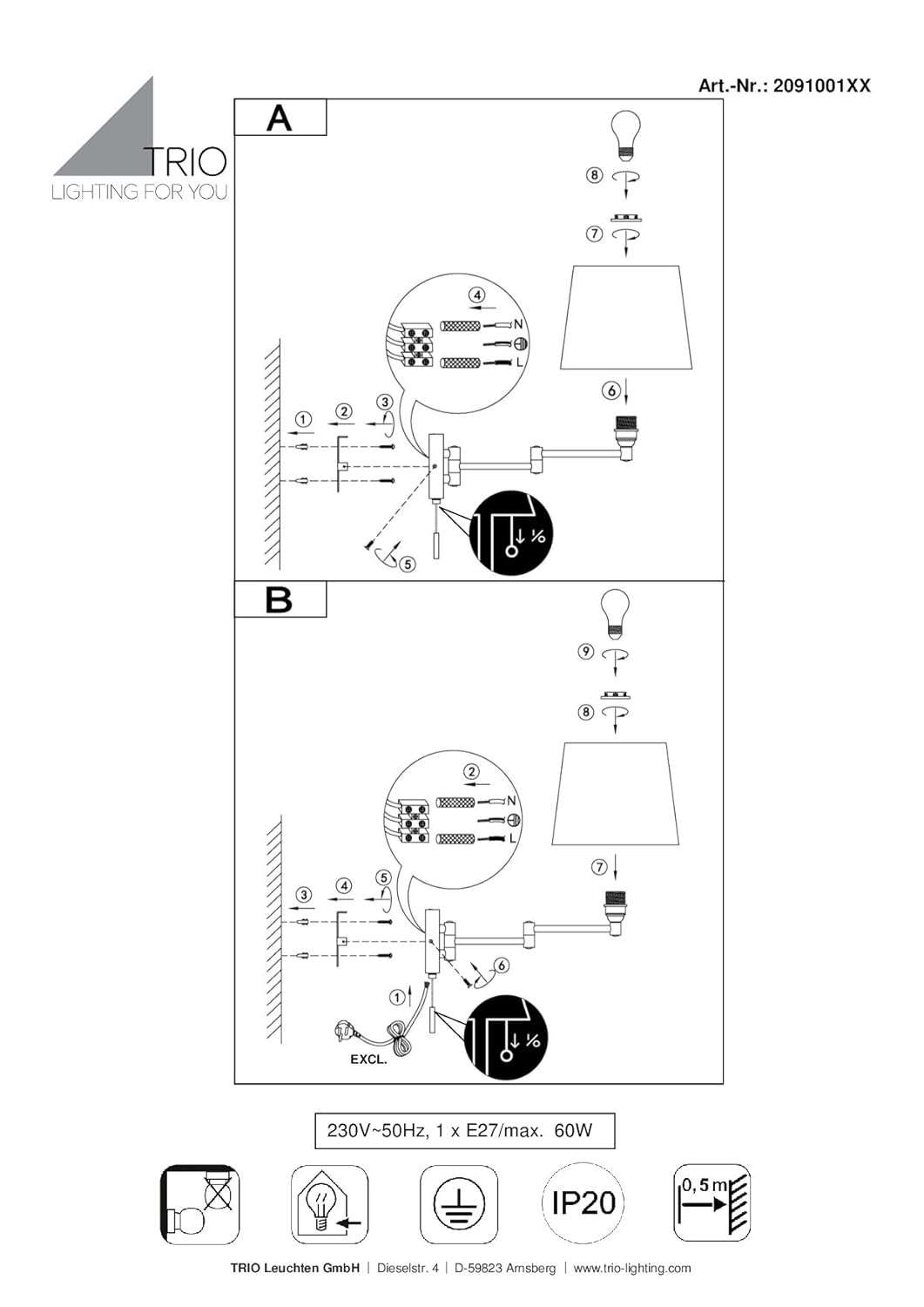 Moderne Stoffschirm Wandleuchte LYON mit flexiblem Arm aus dem Hause TRIO Leuchten Schlicht, edel und designorientiert!Die hochwertige Wandleuchte LYON überzeugt durch einen modernen Stil und ein gradliniges Design. Sie zaubert eine angenehme Lichtstimmung und ist dabei unglaublich dekorativ. Idealerweise findet diese Wandlampe ihren Platz im Schlafzimmer neben dem Bett, denn die Leuchte eignet sich durch die Kombination aus einem schwenkbaren Arm und einer Auslage von 69cm und einer flexibler Anbringung optimal als Leuchte neben dem Bett. Zudem ist sie mit dem Feature FLE Xconnect ausgestattet, so dass diese dank integriertem Kabelauslass wahlweise an beliebiger Position an der Wand befestigt und über ein Kabel mit der Steckdose verbunden werden kann oder ohne Zuleitung für den Festanschluss geeignet ist. Die Kombination aus Messing matt und einem weißen Stoffschirm wird perfekt abgerundet und ergibt ein edles Gesamtbild. Die Leuchte erzeugt durch den stilvollen Leuchtenschirm ein gemütliches Licht, durch die Öffnung an der Oberseite entsteht zusätzlich ein dezenter Lichtkegel an der Decken. Darüber hinaus verfügt die Leuchte über einen Zugschalter für Ein/Aus, mit dem sie sich komfortabel bedienen lässt.* Geeignet für 1x E27 Leuchtmittel bis max. 60 Watt (Nicht enthalten)
