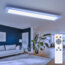 Diese elegante LED-Deckenlampe in Weiß (85 x 19 x 6,3 cm) bietet Ihnen vielseitige Beleuchtungsoptionen. Sie strahlt von warmweißem (2700 K) bis kaltweißem Licht (6500 K) und ist dimmbar. Mit der mitgelieferten Fernbedienung können Sie die Farben Rot, Grün und Blau auswählen. Zudem ermöglicht der Wandschalter drei Lichtstufen: warmweiß, neutralweiß und kaltweiß. Das fest verbaute LED-Leuchtmittel hat eine Leistung von 24 Watt und einen Lichtstrom von 1460 Lumen.