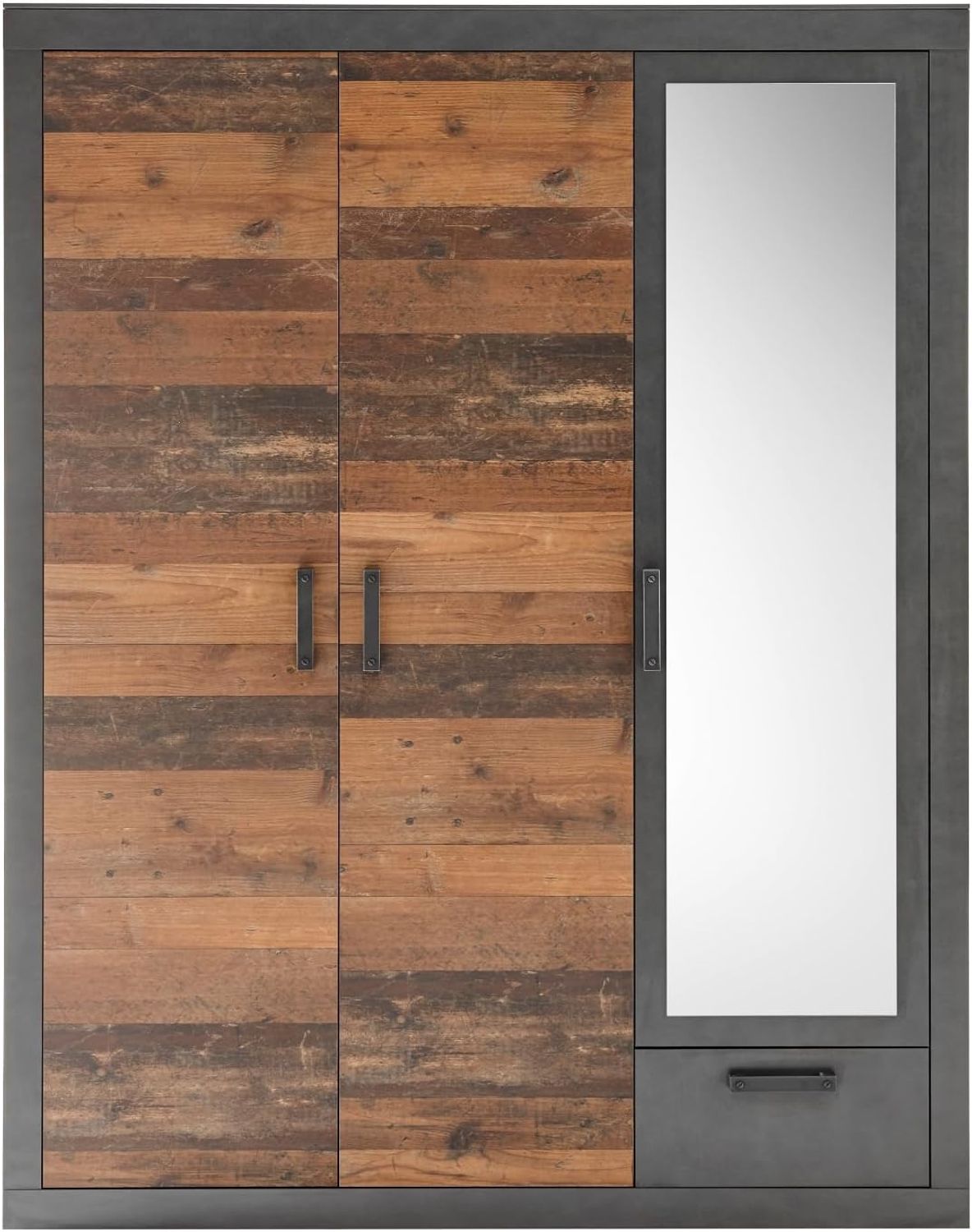 Details: Kleiderschrank Ward GE6213-02 Front Used Wood Dekor, Shabby in Plankenoptik Korpus und Absetzungen Matera grau Dekor B/H/T ca.: 150/201/60 cm 2 Türen 2 Böden / 2 Wäschefächer 1 breite Kleiderstange 1 Tür mit Spiegel 3 Einlegeböden / 4 Wäschefächer 1 Schubkasten Einlegeböden höhenverstellbar Qualität: Moderner Kleiderschrank in trendigem Design Front in Used Wood Dekor, Shabby mit Plankenoptik Touchwood: Mit seh- und fühlbarer Holzstruktur Korpus und Absetzungen in Matera grau Dekor strapazierfähige Melaminbeschichtung Griffe altsilberfarben matt Metallscharniere und Metallschienen kugelgelagert FSC®-zertifizierter Holzwerkstoff, aus kontrolliert nachhaltiger Forstwirtschaft Pflegeleicht durch glatte Oberflächen, einfach feucht abwischen Das Schlafzimmerprogramm Ward bietet eine Vielzahl von Einzelmöbeln mit verschiedenen Stell- und Kombinationsmöglichkeiten Lieferumfang: Telefonische Terminabsprache Ihr Kleiderschrank wird Ihnen bis in das gewünschte Zimmer getragen Zerlegt/Selbstmontage, inkl. bebilderte Aufbauanleitung Montage- und Befestigungsmaterial Dekoration, Beimöbel und Elektrogeräte sind nicht enthalten