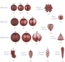 Set-Bestandteile12x kleine Kugel, 12x mittlere Kugel, 12x große Kugel, 6x Geschenk, 6x Bäumchen, 4x Herz, 2x Blatt, 4x Stiefel, 4x gedrehter Zapfen, 4x Eiszapfen, 6x Tannenzapfen
