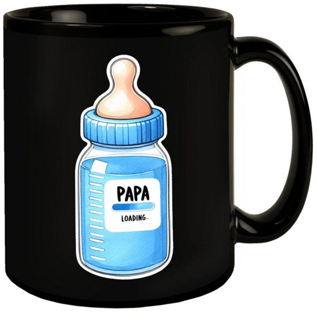 Die 'Werdender Papa Babyflasche Tasse' in Schwarz ist der ideale Begleiter für angehende Väter. Mit ihrem auffälligen Design, das eine süße hellblaue Babyflasche und den humorvollen Spruch 'Papa Loading' zeigt, bringt sie Freude in den Alltag. Perfekt für den ersten Schluck Kaffee oder das Feierabendgetränk, ist diese Tasse ein ideales Geschenk für Babyshower-Partys.