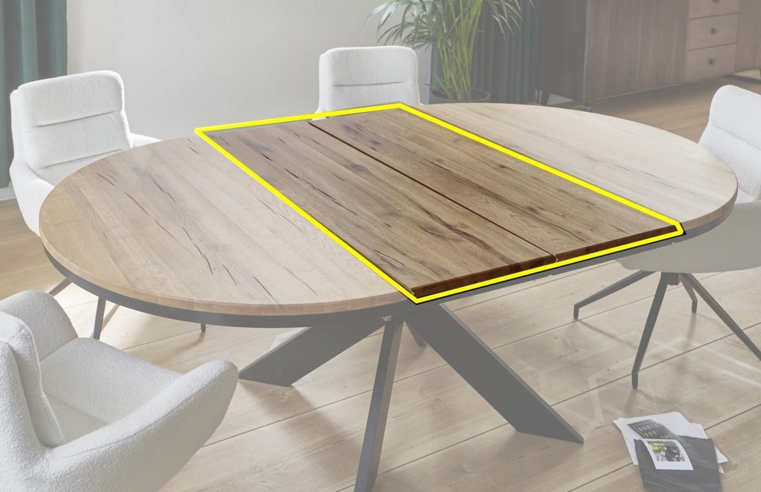 Entdecken Sie den runden, ausziehbaren Esstisch Nottingham von Bodahl, gefertigt aus massivem, rustikalen Eichenholz. Mit einem Durchmesser von 120, 130 oder 140 cm und einer Gesamthöhe von 75 cm bietet dieser Tisch nicht nur Platz für gesellige Runden, sondern auch eine innovative Parallelauszugtechnik für maximale Flexibilität. Die einzigartige Tischplatte mit gewollten Rissen und Vertiefungen verleiht jedem Tisch einen unverwechselbaren Charme.