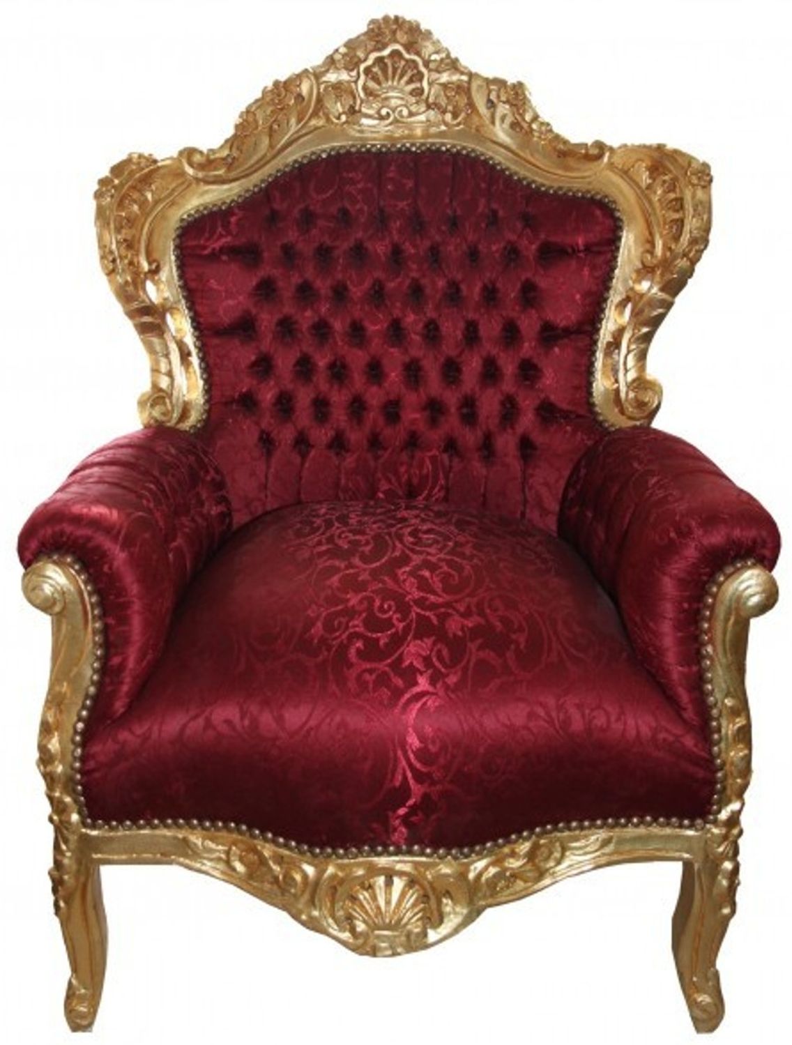 Handgefertigter Barock Sessel "King" in Bordeaux Musterstoff mit goldenen Akzenten. Dieser stilvolle Sessel aus der Kollektion von Casa Padrino vereint elegantes Design und hohen Komfort. Mit einer Höhe von ca. 120 cm, einer Breite von ca. 85 cm und einer Tiefe von ca. 85 cm bietet er eine bequeme Sitzhöhe von ca. 45 cm. Der Sessel ist aus massivem Holz gefertigt und mit edlem Satin Musterstoff (100 % Polyester) bezogen. Die Füllung besteht aus 100 % Polyätherschaum-Polsterung.