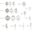 Set-Bestandteile12x kleine Kugel, 12x mittlere Kugel, 12x große Kugel, 6x Geschenk, 6x Bäumchen, 4x Herz, 2x Blatt, 4x Stiefel, 4x gedrehter Zapfen, 4x Eiszapfen, 6x Tannenzapfen