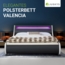 Produktmerkmale: - Bequem gepolstertes Bettgestell - Modernes geschwungenes Design - Ideal für 180x200 cm große Matratzen - Stabiler zwei-geteilter Lattenrost - Hohes Kopfteil mit LED-Beleuchtung - LED-Licht per Fernbedienung steuerbar - Pflegeleichter Bezug in Leder-Optik - Einfache und schnelle Eigenmontage Stabiles Bettgestell Der 189,5x223 cm große Bettrahmen aus Holz und Metall wird zum Mittelpunkt Ihres Schlaf- oder Gästezimmers. Er ist als großzügiges Jugendbett oder breites Doppelbett verwendbar und gut gepolstert. Der Kunstlederbezug lässt sich spielend einfach mit einem feuchten Tuch reinigen. Langlebiger Lattenrost Zum Bettgestell wird ein passender zwei-geteilter Lattenrost mit Holzsprossen sowie freitragender Mittelleiste geliefert. Er stützt Ihre 180x200 cm große Matratze optimal ab und lässt Sie gemütlich wie auch sicher in einen gesunden Schlaf und schöne Träume sinken. Stimmungsvolles Ambiente Ein im Kopfteil eingelassenes LED-Licht sorgt für eine schöne Belichtung im Schlafzimmer. Es ist per Fernbedienung steuerbar und variiert zwischen 16 verschiedenen Lichtfarben. Die indirekte Beleuchtung der LED-Leiste erspart Ihnen somit sogar den Kauf einer Nachttischlampe. Schwungvolles Design Das schöne Bettgestell überzeugt durch elegant geschwungene Seitenteile, ein 71 cm hohes Kopfteil mit integrierter LED-Leiste und einem schlichten Bezug aus weichem Kunstleder. Dieses Zusammenspiel aus Eleganz und Moderne macht das Polsterbett Valencia zum wahren Eyecatcher.