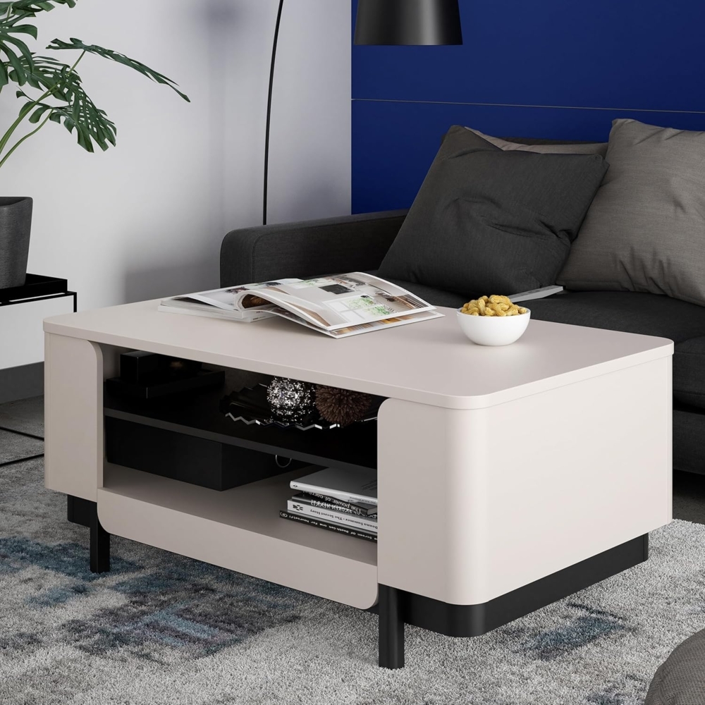 Der Couchtisch Venedig / Vodol in Beige ist ein stilvoller Mittelpunkt für Ihre Sofa-Ecke. Mit den Abmessungen von 115 x 49 x 55 cm bietet er nicht nur eine ansprechende Optik, sondern auch praktischen Stauraum. Die sandfarbene Platte und die geschlossenen Seiten aus Holzwerkstoff schaffen eine warme Atmosphäre, während die schwarzen Füße und Absetzungen einen eleganten Kontrast setzen.