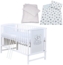Das Baby-Delux Komplettbett "Mia" bietet Ihrem Baby einen sicheren und gemütlichen Schlafplatz. Hergestellt aus robustem Kiefermassivholz, überzeugt es mit einem zeitlosen Design in Weiß. Die Innenmaße betragen 120 x 60 cm, und der höhenverstellbare Lattenrost ist in drei Positionen (20 cm, 36 cm, 49 cm) einstellbar. Inklusive ist eine komfortable Schaumstoffmatratze (120 x 60 x 6 cm) sowie ein 4-teiliges Bettwäsche-Set aus 100% Baumwolle.