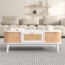 Eleganter Couchtisch mit den Abmessungen 110 x 55 x 38,5 cm, der zeitlose Natürlichkeit und moderne Wohnästhetik vereint. Die Kombination aus weißer Oberfläche und warmen Holzton schafft eine freundliche Atmosphäre. Handgefertigte Türen aus Massivholz und dekorative Rattandetails verleihen dem Tisch eine rustikale Ausstrahlung. Mit stabilem Massivholzgestell und großzügigem Stauraum ist dieser Tisch sowohl optisch ansprechend als auch funktional.