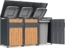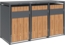 Westmann Varius 3 | Metall Mülltonnenbox 3er | 3x240 L | Holzoptik Modern, funktional und dekorativ! Die Mülltonnenbox Varius 3 von Westmann versteckt deine Mülltonnen gekonnt und wird dank des ansprechenden Materialmixes zum Blickfang auf deinem Grundstück. Mülltonnenbox Varius von Westmann — Dekoration, Hygiene, Ordnung! Kaum ein Gegenstand des täglichen Gebrauchs ist so essenziell und gleichzeitig so unansehnlich wie die Mülltonne. Mit der Mülltonnenbox Varius von Westmann lösen wir dieses Problem im Handumdrehen! Die Mülltonnenverkleidung lässt im Handumdrehen 3 Mülltonnen hinter einem modernen Korpus aus grauem Stahl und Fronten in Holzoptik verschwinden. Um deine Mülltonne zu befüllen, öffnest du einfach den Deckel der Mülltonnenbox. Dieser ist via Seilhalterung am Deckel der Mülltonne befestigt. Die am Boxendeckel angebrachten Gasdruckfedern verhindern ein unkontrolliertes Zufallen des Deckels — das Befüllen der Mülltonne ist somit problemlos und ohne Verletzungsrisiko möglich. Dank leichtgängiger Fronttür lässt sich die Tonne mühelos in die Mülltonnenbox hineinschieben. Highlights auf einen Blick: * Platz für 3 Mülltonnen je 60 L, 120 L oder 240 L * Robuste Konstruktion: Rahmen sowie Verkleidung aus verzinktem Stahl + Pulverbeschichtung Türrahmen aus Edelstahl * Naturnahes Design: Fronten in Holzoptik | UV-Druck * Praktische Handhabung: Mülltonnendeckel ist am Deckel der Mülltonnenbox befestigt * Gasdruckfedern am Deckel: einfaches Befüllen der Mülltonne ohne unkontrolliertes Zufallen * Magnetischer Türanschlag: unkompliziertes Schließen der Tür Schutz vor Sonne und Ungeziefer! Neben der sichtbaren Aufwertung der Mülltonne schützt die Mülltonnenbox deine Mülltonne auch vor starker Sonneneinstrahlung und beugt somit intensiver Geruchsentwicklung vor. Außerdem erschwerst du Mäusen, Ratten und Co. den Zugang zu deinen Abfällen und sorgst so für ein hygienischeres Umfeld. Hinweis: Bitte befestige deine Mülltonnenbox nach korrekter Ausrichtung gemäß der Verankerungspunkte von Grundrahmen A auf festem Untergrund. Die Mülltonnenbox Varius 3 von Westmann ist ein vielseitiger Allrounder und der dekorative Hingucker für Haus und Garten!