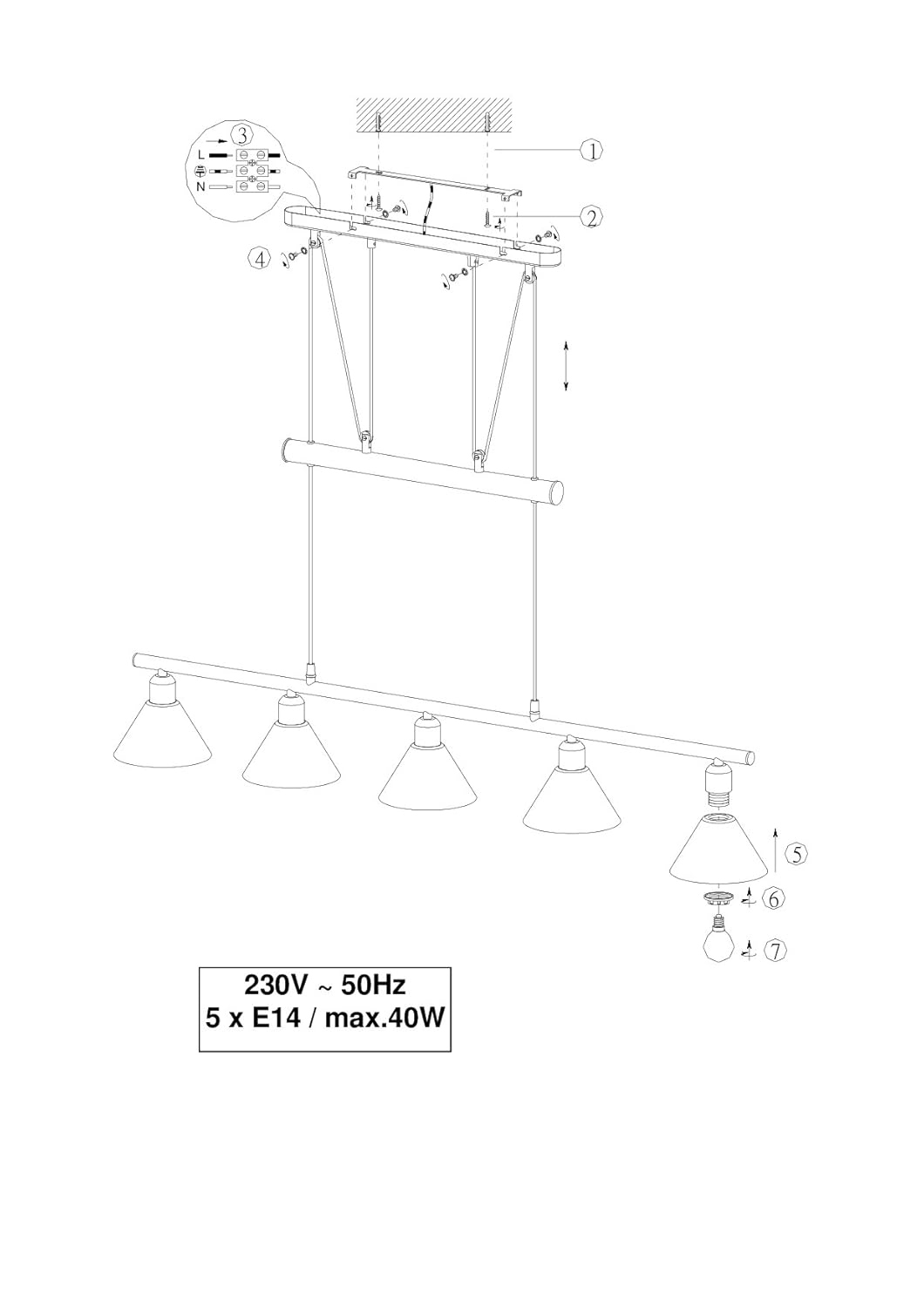 - Fünf E14 Fassungen für Leuchtmittel bis max. 40 Watt