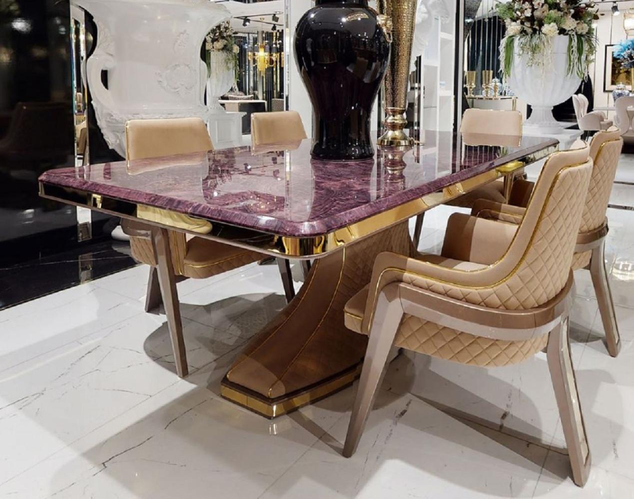 Casa Padrino präsentiert den luxuriösen Art Deco Esstisch in Lila, Beige und Gold. Dieser handgefertigte Küchentisch aus Massivholz überzeugt durch seine edle Verarbeitung und die Tischplatte in Marmoroptik. Mit einer Länge von ca. 220 cm, einer Breite von ca. 110 cm und einer Höhe von ca. 80 cm bietet er ausreichend Platz für gesellige Runden. Das pflegeleichte Material sorgt für eine langanhaltende Freude an diesem stilvollen Möbelstück.