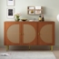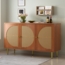 Dieses moderne Rattan-Sideboard aus walnussbrauner Spanplatte vereint elegantes Design mit praktischer Funktionalität. Mit einer Gesamtgröße von 129,8 x 40 x 76 cm bietet es reichlich Stauraum hinter drei Türen mit dekorativer Rattan-Webung. Die verstellbaren Einlegeböden ermöglichen eine flexible Anpassung des Stauraums. Robuste Materialien und Metallfüße mit 15 cm Höhe sorgen für Stabilität und eine ansprechende Optik. Ideal für verschiedene Wohnräume.