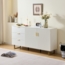 Dieses moderne Sideboard in elegantem Weiß bietet mit seinen großzügigen Abmessungen von 160 x 40 x 81,5 cm viel Stauraum. Aus hochwertigem MDF gefertigt, kombiniert es stilvolles Design mit Funktionalität. Drei Schubladen und zwei Türen ermöglichen eine flexible Aufbewahrung von Besteck und Küchenutensilien. Die goldfarbenen Zinklegierungsgriffe und stabilen braunen Stahlbeine verleihen dem Möbelstück eine moderne Note und sorgen für Langlebigkeit.