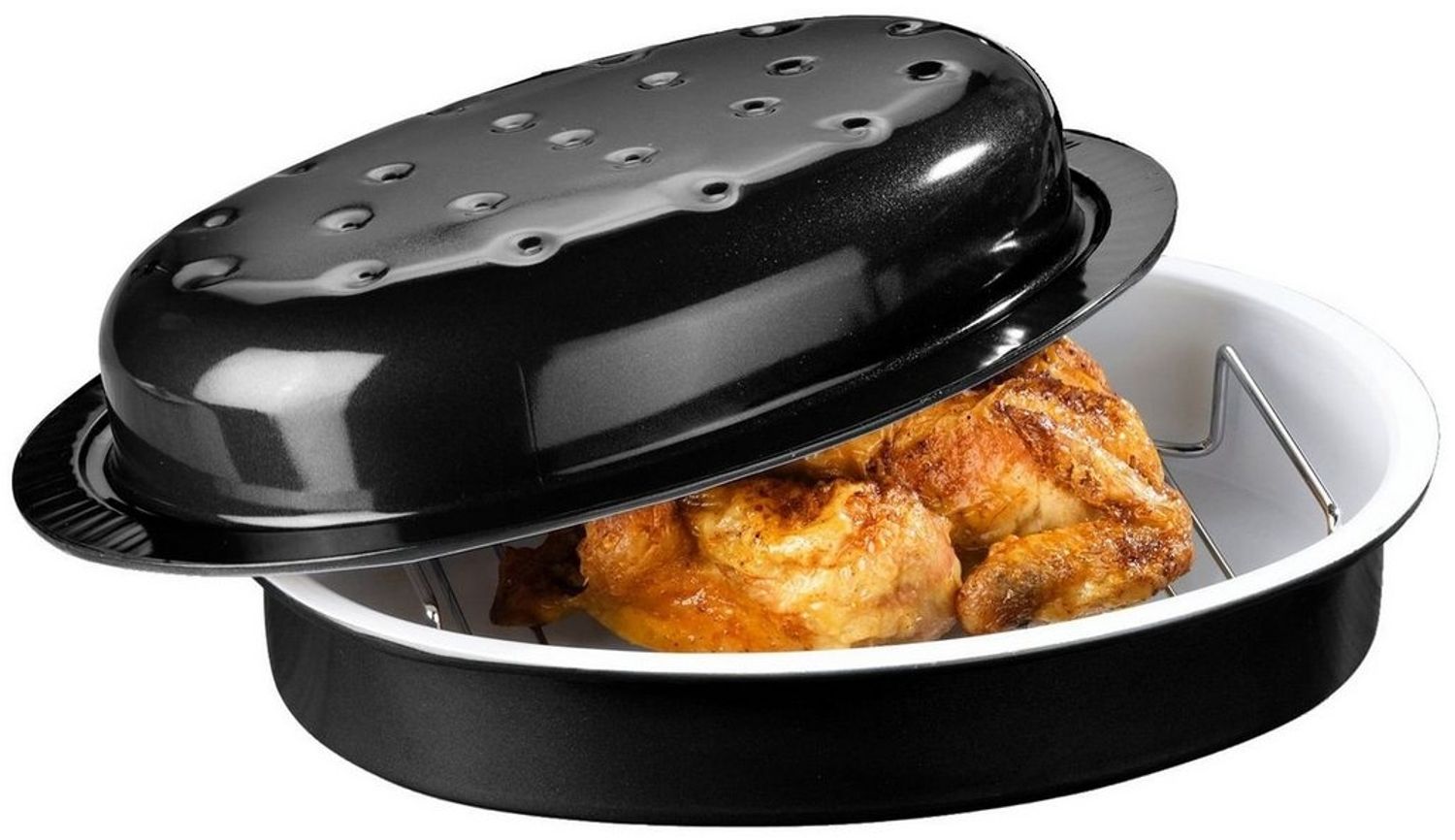 Der Schmortopf mit einer Durchmesser von 32 cm und einer Höhe von 24 cm ist ideal für die Zubereitung von Fleisch, Fisch und Gemüse. Die kratzfeste Keramik-Beschichtung sorgt für eine einfache Reinigung und ermöglicht das Schmoren im eigenen Saft. Der Wabendeckel gewährleistet eine gleichmäßige Hitzeverteilung und optimale Dampfzirkulation, während der verchromte Rosteinsatz überflüssiges Fett abtropfen lässt. Der Topf ist für Gas- und Elektroherde sowie Backöfen geeignet und spülmaschinengeeignet.