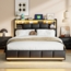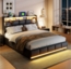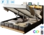 Praktisches Polsterbett mit Stauraum und LED-Beleuchtung. Das Bettgestell aus Kunstleder in Schwarz bietet mit einem großen Bettkasten und einem stabilen Metallrahmen optimalen Komfort und Funktionalität. Mit integrierten USB-Anschlüssen und Steckdosen im Kopfteil sind Ihre Geräte stets aufgeladen. Die Gesamtabmessungen betragen 165 x 211 x 105 cm, geeignet für Matratzen der Größe 160 x 200 cm.