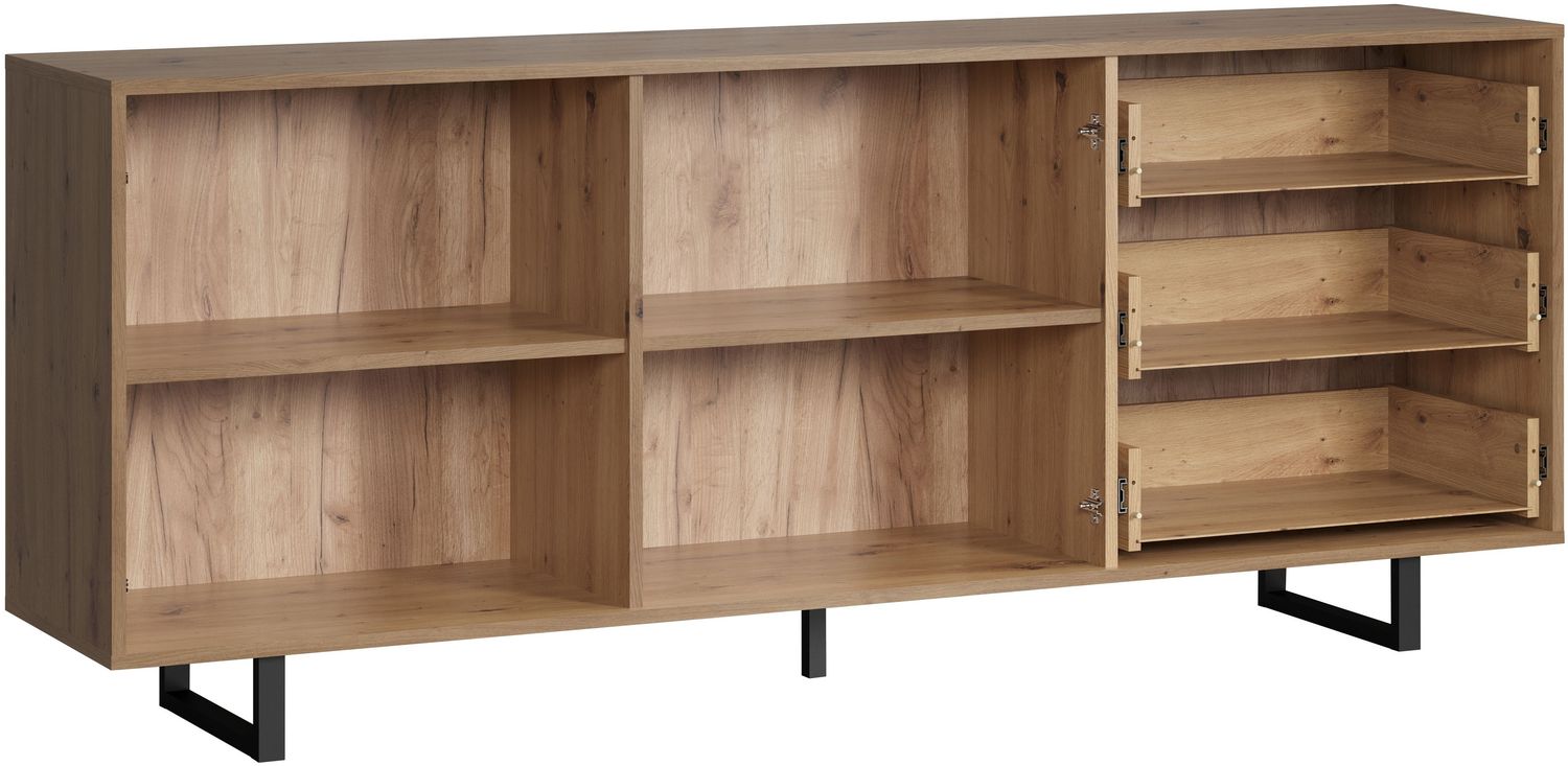Modernes Sideboard in Artisan Eiche Melamin, das stilvolles Design mit praktischer Funktionalität vereint. Mit den Maßen 183 x 75 x 40 cm passt es ideal in mittelgroße Räume und bietet durch 2 Türen und 3 Schubladen ausreichend Stauraum für Alltagsgegenstände, Bücher und Deko. Hergestellt aus robustem Holzwerkstoff mit Metallakzenten, ist es pflegeleicht und kratzfest. Die einfache Montage ermöglicht eine flexible Positionierung im Raum.