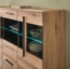 Das Highboard Design-D kombiniert stilvolles Design mit praktischer Funktionalität. Die Front aus tiefgezogenem MDF in Evoke Eiche Dekor verleiht dem Möbelstück eine moderne Optik ohne Umleimerkanten. Mit den Maßen von ca. 160 x 126 x 42 cm (B/H/T) bietet es großzügigen Stauraum und Präsentationsfläche. Hinter 3 Glastüren befinden sich 6 elegante Vitrinenfächer sowie 5 geschlossene Fächer, ergänzt durch zwei geräumige Schubkästen mit Soft-Close-Funktion.