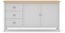 Das Calicosy 'MISTI' Sideboard vereint klassischen Stil mit praktischer Funktionalität. Mit einer Länge von 150 cm, einer Breite von 40 cm und einer Höhe von 80,5 cm bietet es ausreichend Stauraum durch zwei Türen und drei Schubladen. Hergestellt aus massiver Kiefer und veredelt mit einer Eichenplatte, bringt es eine warme Note in Ihr Zuhause. Die silbernen Muschel- und runden Türgriffe runden das elegante Design ab.