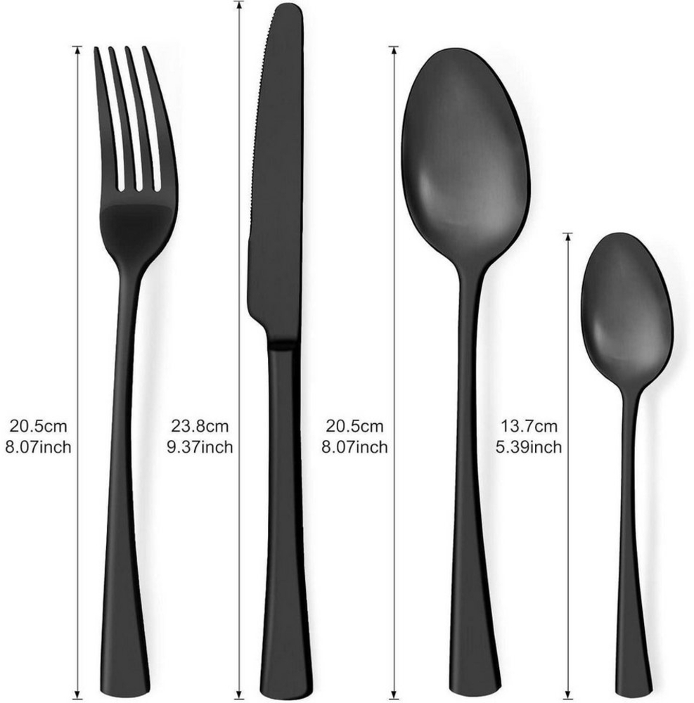 Das 24-teilige Besteckset aus Edelstahl in elegantem Schwarz Matt ist ideal für 6 Personen. Es umfasst 6 Messer, 6 Gabeln, 6 Löffel und 6 Teelöffel, die sowohl für formelle Anlässe als auch für entspannte Abende geeignet sind. Mit einem Vakuum-Galvanik-Finish bleibt die matte Oberfläche dauerhaft schön und widerstandsfähig. Das handpolierte Design sorgt für einen angenehmen Griff und eine hochwertige Haptik.