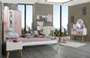 Praktisches und modernes 5-teiliges Jugendzimmer-Set für Mädchen, bestehend aus einem Bett, Nachttisch, Schreibtisch, Kleiderschrank und Kommode. Das Set überzeugt durch seine ansprechende Farbgestaltung und die Verwendung von echtem Holz im Innengestell. Die verschiedenen Möbelstücke bieten ausreichend Stauraum und sind ideal für ein stilvolles und funktionales Kinderzimmer.