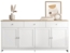 Praktisches Sideboard im Landhausstil mit drei Schubladen und vier Klappen. Es bietet ausreichend Stauraum und überzeugt durch seine ansprechende Kombination aus Weiß und Holzfarbe. Mit einer Tragfähigkeit von 70 kg und einer Montagezeit von 30-60 Minuten ist es ideal für Ihr Zuhause.