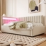 Dieses Polsterbett Schlafsofa 90 x 200 vereint Eleganz, Funktionalität und Komfort. Der luxuriöse Samtstoff und das klassische vertikale Streifendesign machen es ideal für kompakte Räume. Mit farbwechselnden LED-Leuchten im Kopfteil, einem hydraulischen Stauraummechanismus und einem robusten Lattenrost bietet es sowohl Stil als auch praktischen Nutzen. Die wendbaren seitlichen Kopfteile ermöglichen eine flexible Anpassung an Ihre Raumaufteilung.
