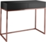 Der AX LIVING Schminktisch in Schwarz Lortie vereint modernes Design mit hoher Funktionalität. Mit einer Breite von 80 cm und einer Tiefe von 35 cm ist er ideal für kompakte Räume. Die zwei geräumigen Schubladen (Höhe: 11,5 cm) bieten praktischen Stauraum für Kosmetik und Accessoires. Das edle, kupferfarbene Metallgestell aus 20 mm Vierkantprofil sorgt für einen stilvollen Kontrast zur widerstandsfähigen, 18 mm starken Tischplatte in Schwarz.