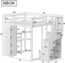 Merax Hochbett mit Kommode mit Regalen und Sicherheits-Kletterleiter mit Aufbewahrungsschubladen, Massivholz, Weiß, 140x200 cm