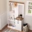 Mit einem kompakten Design von 110,5 x 38 x 191 cm bietet dieses Garderobenset aus Holz in Weiß vielseitige Aufbewahrungslösungen. Es verfügt über einen integrierten Spiegel, zwei Schubladen, eine Tür für Schuhe und einen Haken zum Aufhängen von Mänteln. Der untere Bereich beinhaltet eine Schirmablage und ein Schuhregal. Kleine Haken sorgen für Ordnung bei Schlüsseln. Ideal für verschiedene Wohnstile, vereint es Funktionalität und Eleganz.