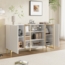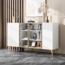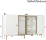 Das Merax Sideboard mit einer Breite von 150 cm bietet eleganten Stauraum für Ihr Wohnzimmer oder Esszimmer. Mit vier asymmetrisch angeordneten Türen und einem grifflosen Design vereint es modernes Design mit Funktionalität. Robuste Materialien wie MDF und Aluminiumrahmen garantieren Stabilität, während die goldfarbenen Metallfüße einen industriellen Touch verleihen.